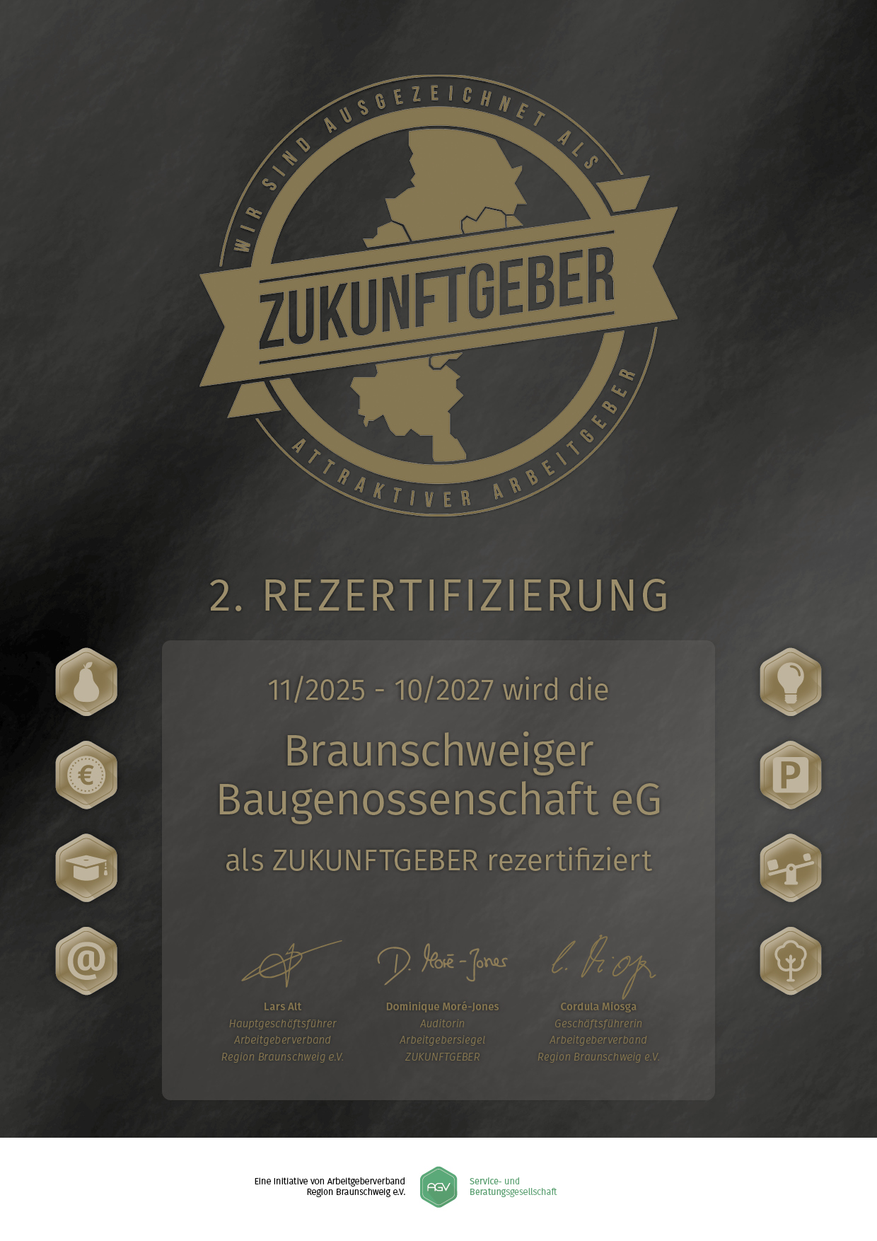 Seit Sommer 2018 vergibt der Arbeitgeberverband Region Braunschweig e.V. das Siegel „ZUKUNFTGEBER“. Voraussetzung ist die Teilnahme an einem Zertifizierungsverfahren des Arbeitgeberverbandes. ZUKUNFTGEBER ist eine Auszeichnung für besonders attraktive Arbeitgeber der Region Braunschweig-Wolfsburg.